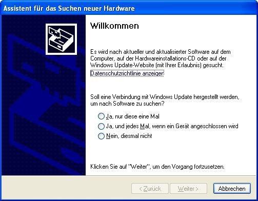 Windows erkennt das Gerät im Service-Mode nicht und meldet eine neue Hardware-Komponente. Ignorieren Sie die Meldung durch einen Klick auf "Abbrechen".