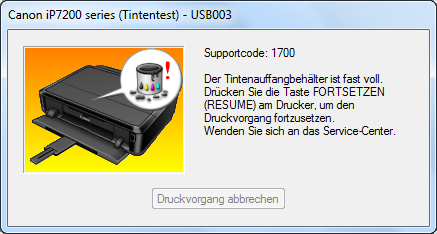 Wenn nach dem Einschalten des Druckers am Computer die folgende Warnmeldung erscheint, ist der Resttintentank zu 95 Prozent voll. In diesem Zustand kann man noch weiterdrucken, wenn man die Meldung durch Drücken der Resume-Taste am Drucker bestätigt.