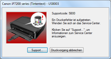Fehleranzeige am Drucker: Wenn der Resttintentank fast voll ist, blinkt die orange Kontrolllampe acht Mal auf.Erreicht der intere Zähler einen Füllstand von 100 Prozent, erscheint eine Fehlermeldung mit dem Fehlercode "5B00". Der Drucker verweigert endgültig den Dienst.