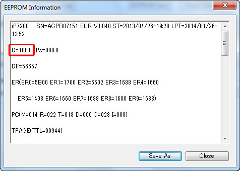 Klicken Sie nun erneut auf EEPROM Save und vergewissern Sie sich, dass die Angabe für den Resttintentank nun auf D=000.0 zurückgesetzt ist.