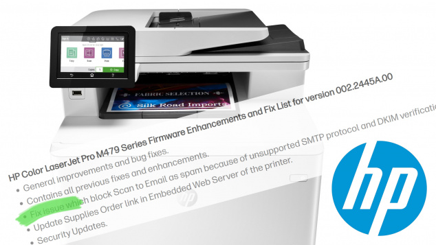 Behebung des Problems, das Scan to Email als Spam blockiert, weil das SMTP-Protokoll und die DKIM-Verifizierung nicht unterstützt werden.HP, Fehlerprotokoll zum CLJ Pro M479